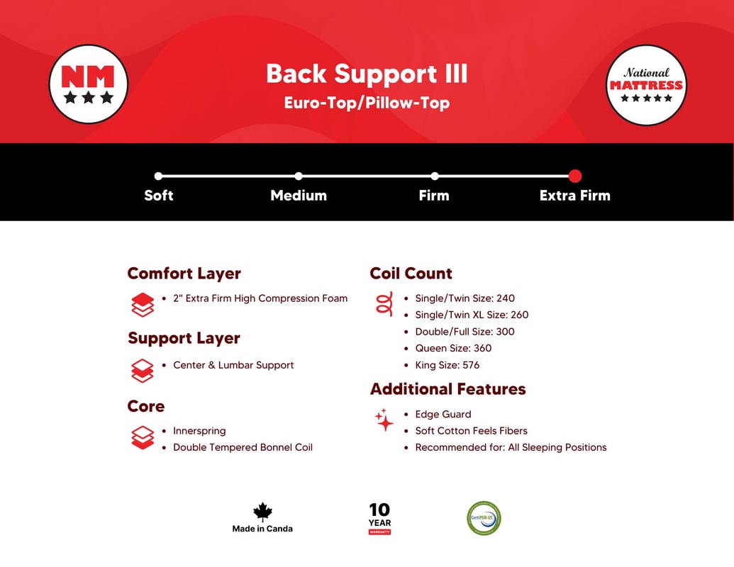 Elevate your sleep quality with the NM 10" Extra-Firm Euro Top Mattress, where comfort meets cutting-edge innovation. This meticulously designed mattress offers robust support, combining a classic firm feel with modern comfort technologies. Experience the cushioning of a plush top while enjoying the stability of the reinforced Bonnell coil core beneath. Crafted with eco-friendly materials in Canada, wake up revitalized every morning ready to take on the day.