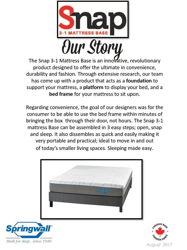 Springwall is a proudly Canadian mattress manufacturer with a heritage of quality and innovation since 1949. As the only 100% Canadian-owned national mattress brand, Springwall offers trusted comfort engineered for the needs of Canadian sleepers.