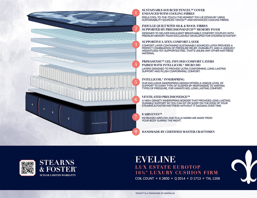 This Stearns & Foster mattress is engineered to provide a balance of cushioning and deep support through its coil system and comfort layers.