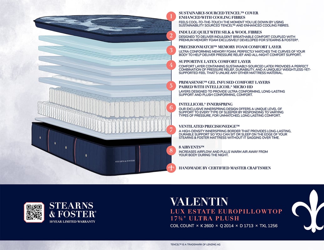 Immerse yourself in unparalleled luxury with the Stearns & Foster Lux Estate Europillowtop Plush Mattress. Designed for those who appreciate exquisite comfort and meticulous craftsmanship, this mattress features a sustainably-sourced, cool-to-the-touch cover that promises a refreshing sleep experience from the very first moment. Indulge in layers of sumptuous silk and wool, combined with innovative cooling technologies, and enjoy rejuvenating rest every night.